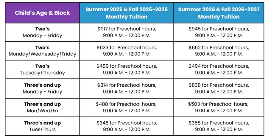 Tuition is based on each child's enrollment. If it is necessary to withdraw a child during the school year, we ask that parents give written notice as far in advance as possible, but no later than two weeks prior to the withdrawal. The fees listed below reflect the upcoming Summer 2026 and Fall 2026 - Spring 2027 sessions for regular preschool hours 9:00 - 12:00 P.M.